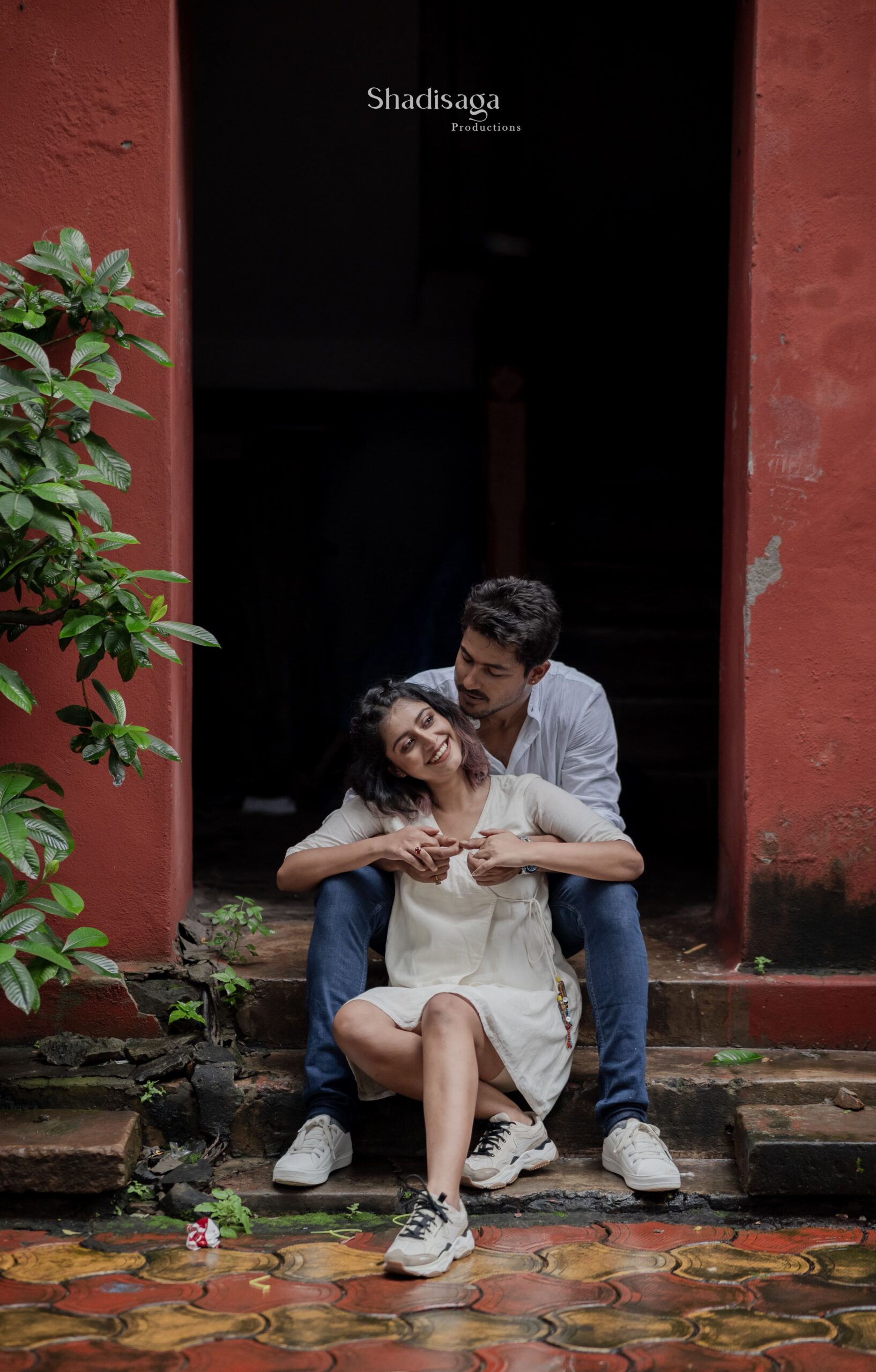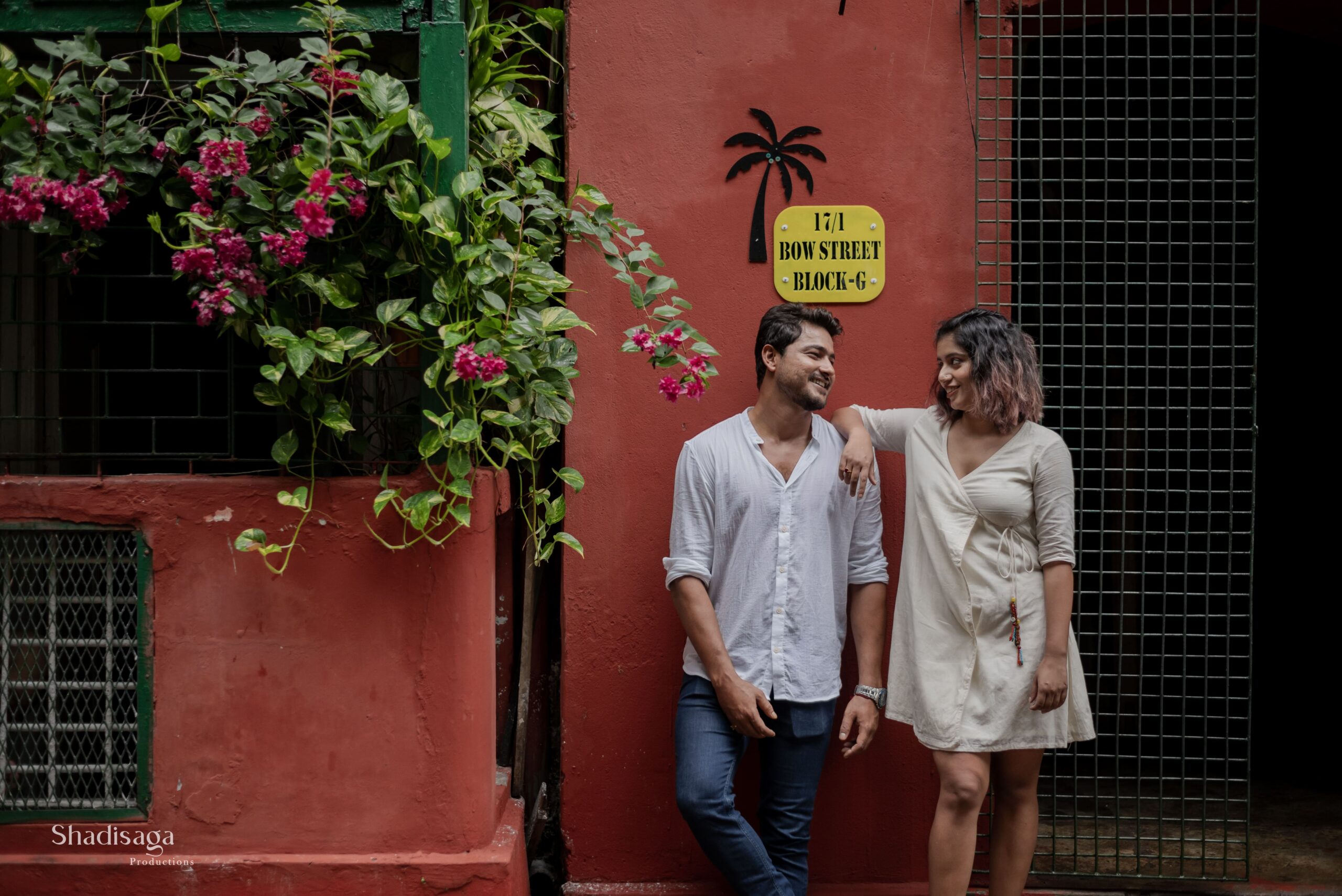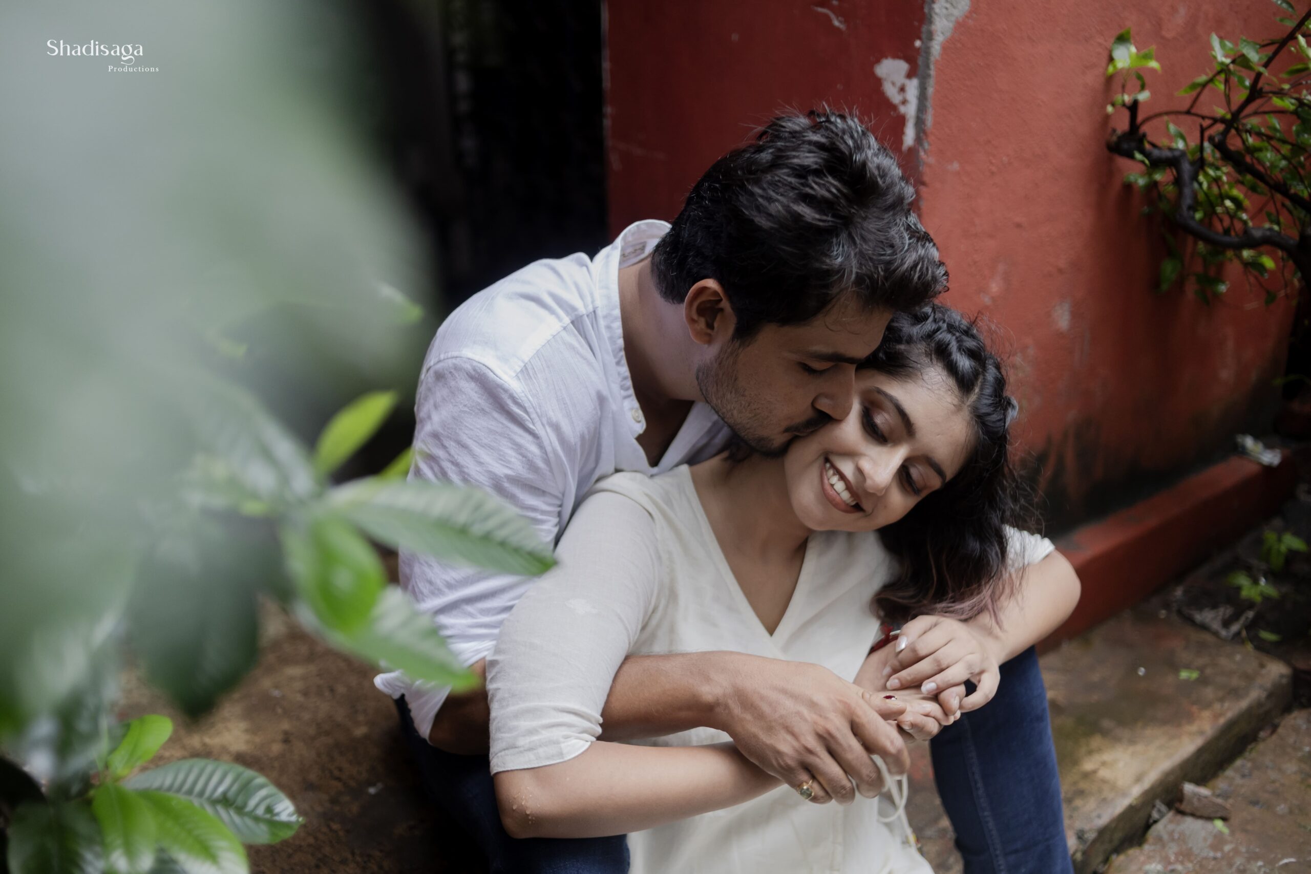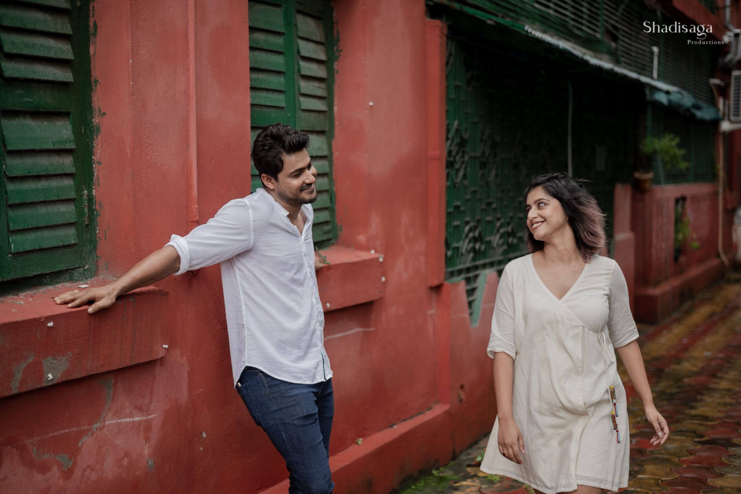 A candid pre-wedding photoshoot featuring a couple sharing a warm moment against a rustic red backdrop. Captured by Shadisaga Productions