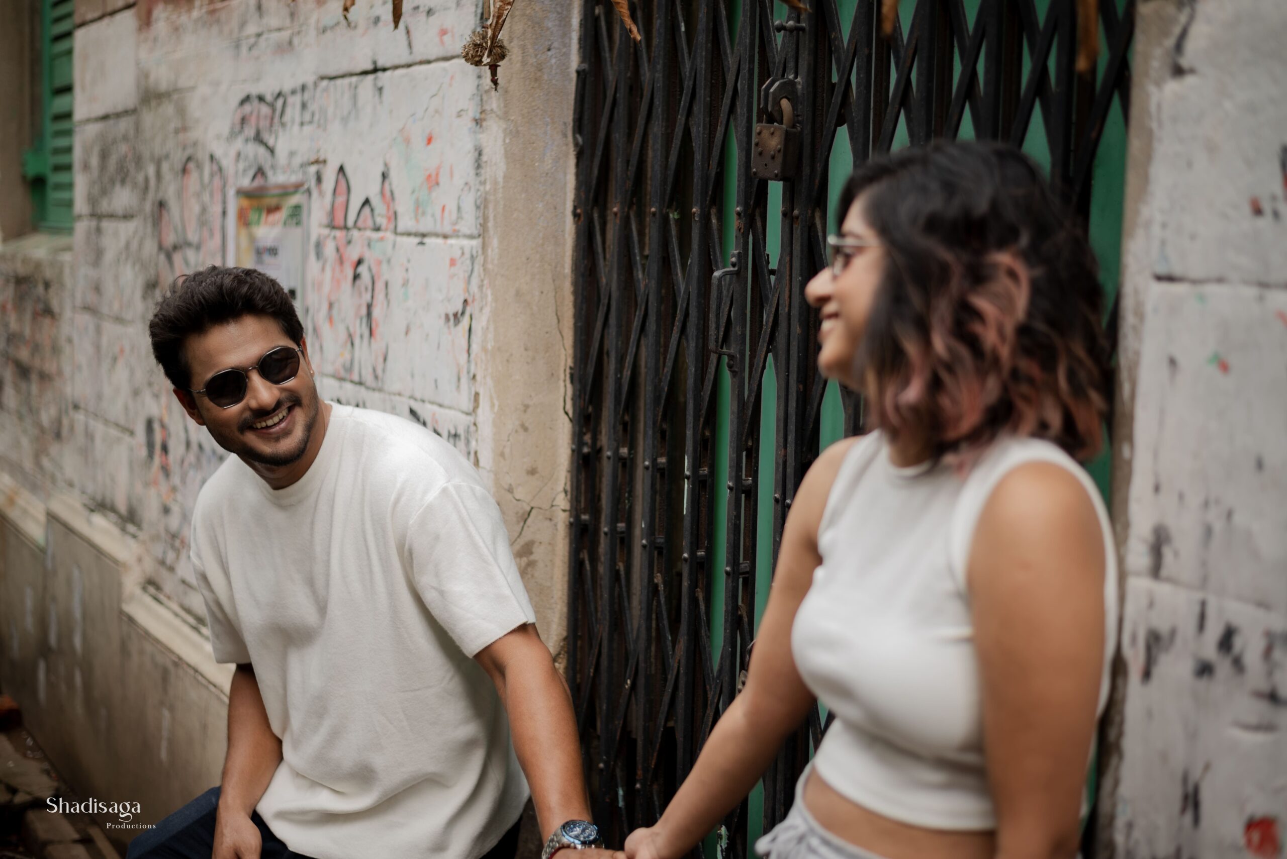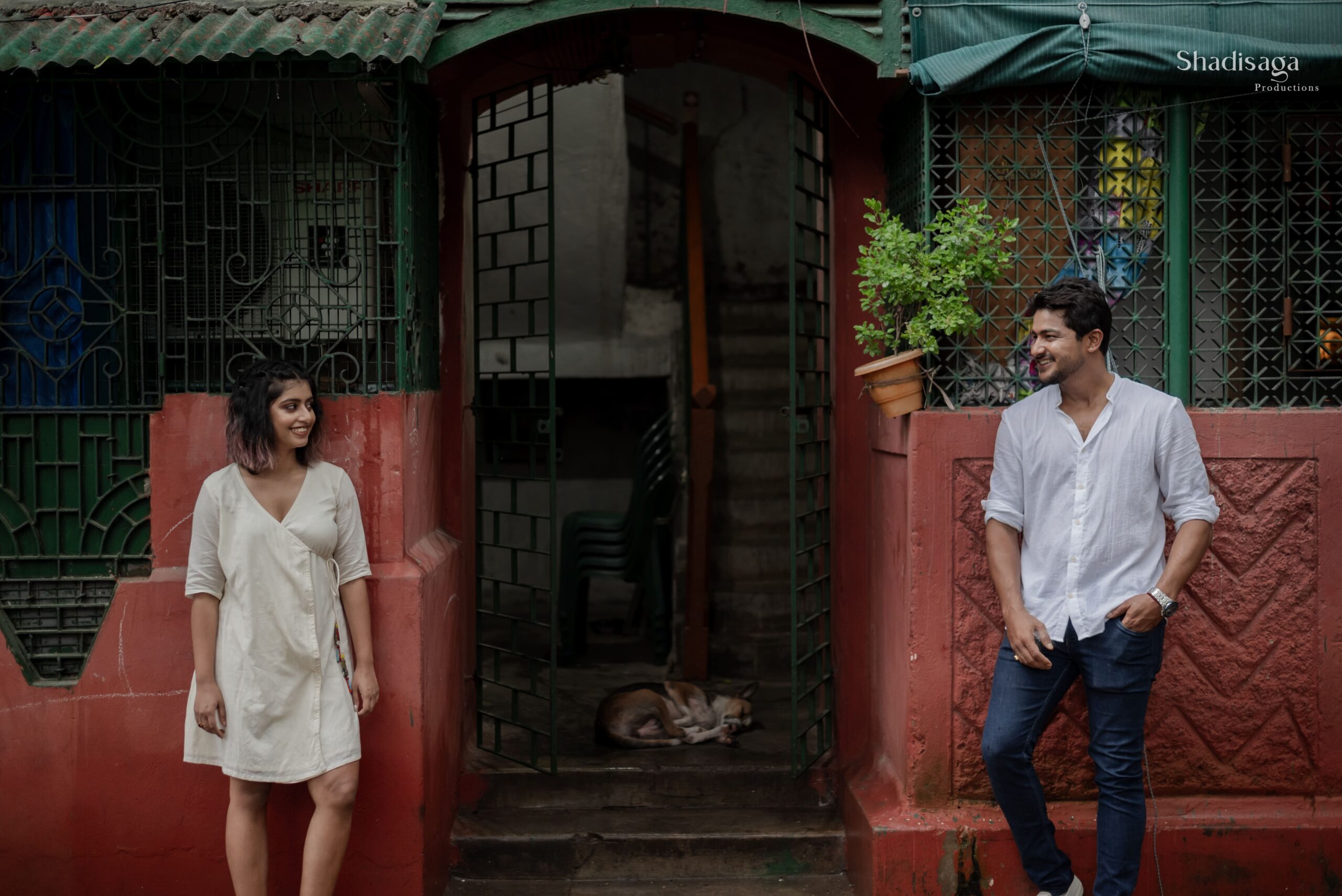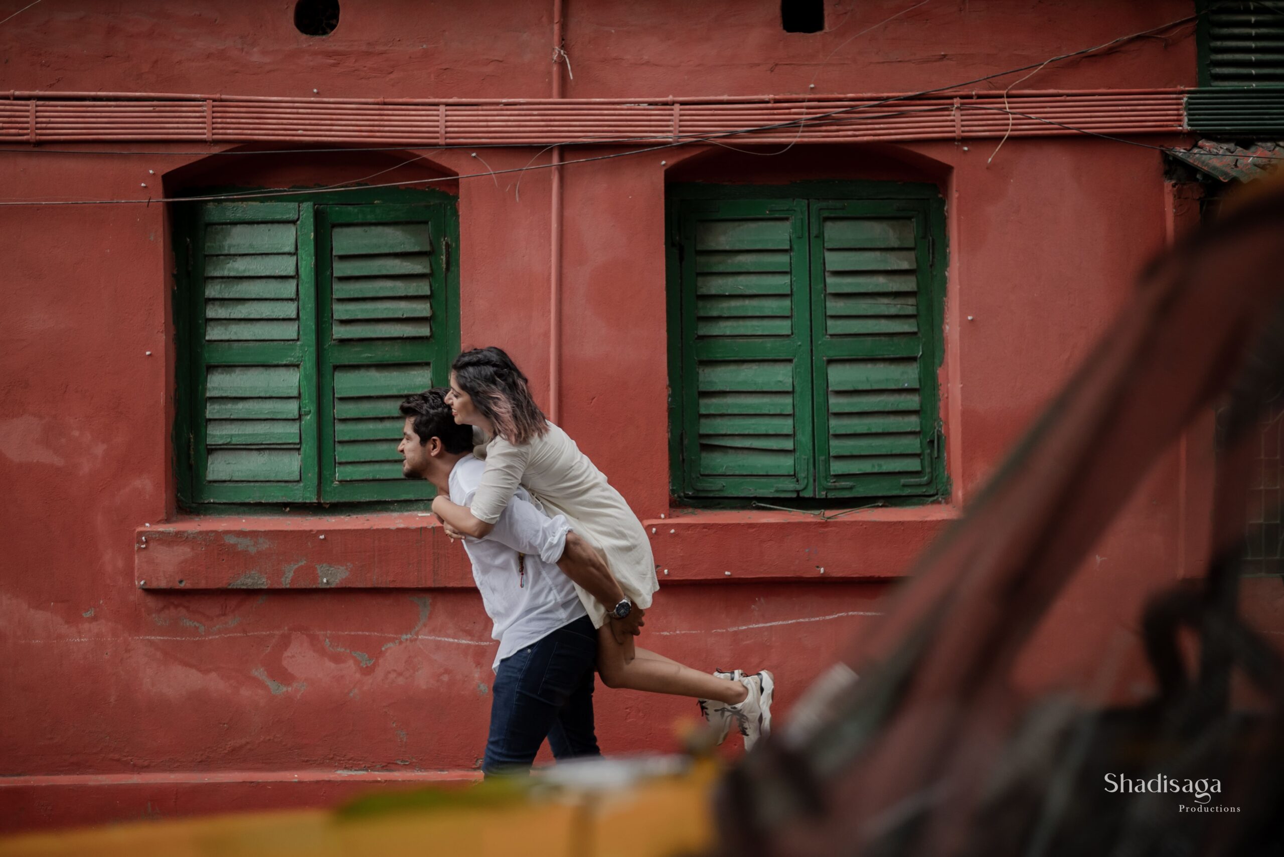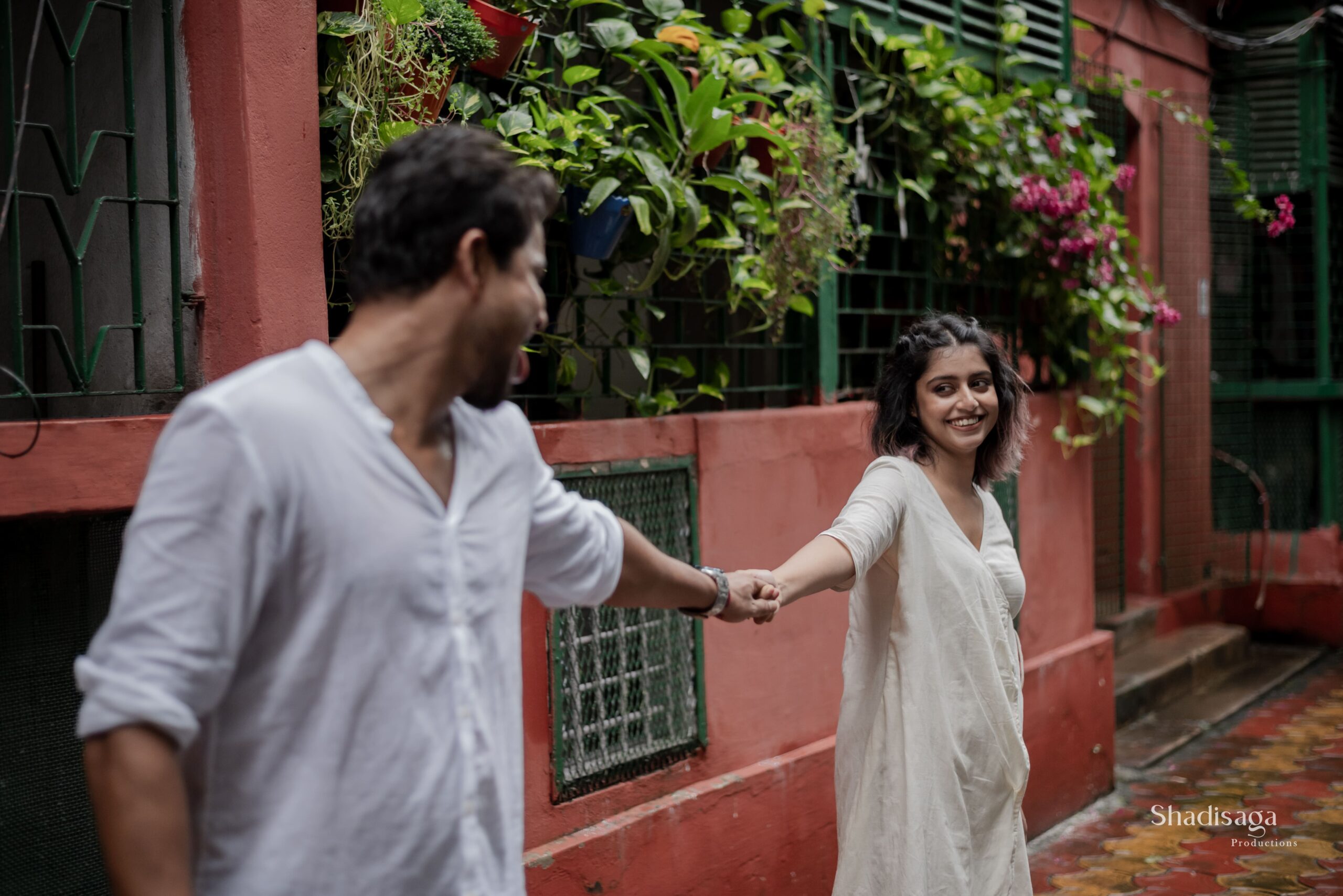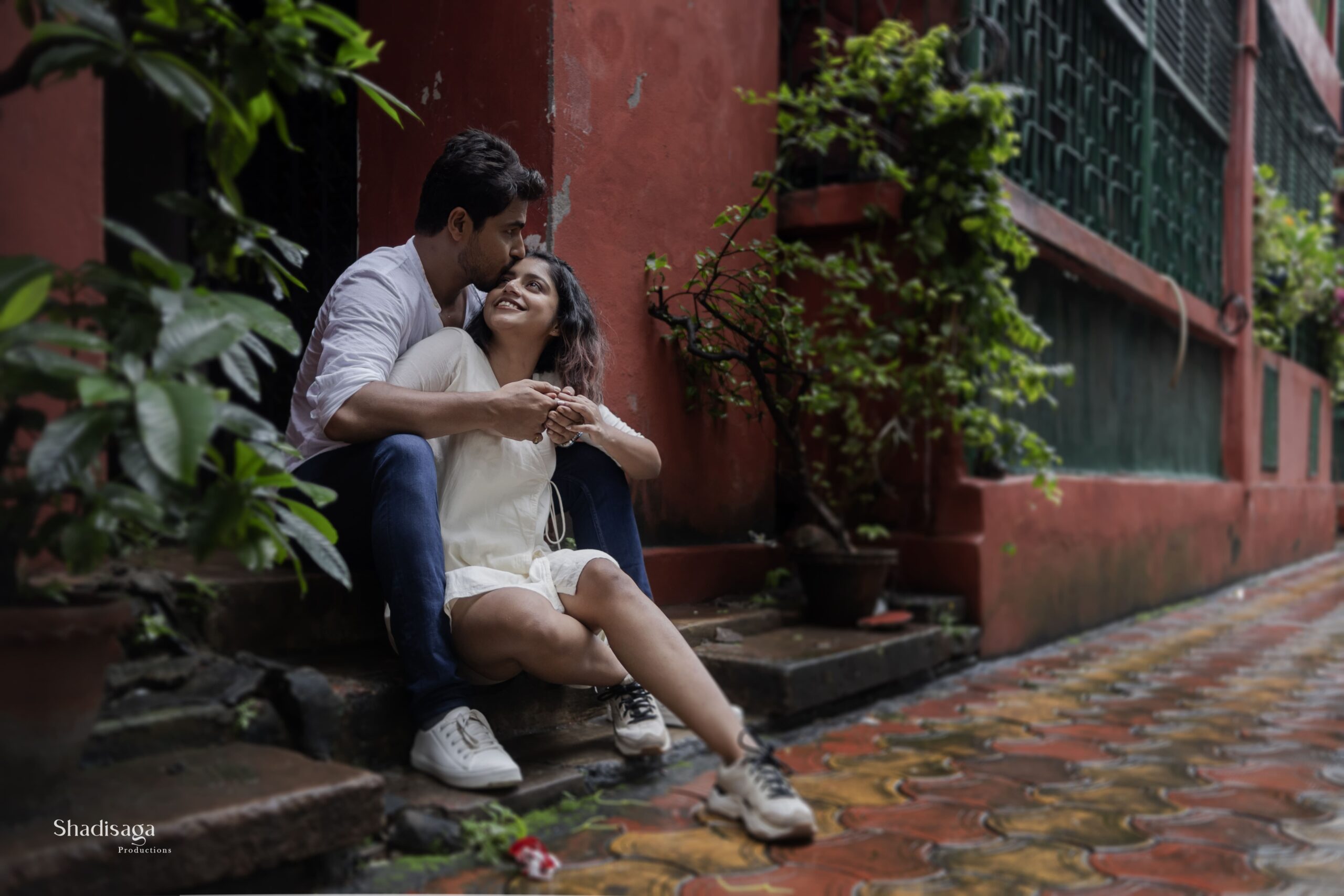 A candid pre-wedding photoshoot featuring a couple sharing a warm moment against a rustic red backdrop. Captured by Shadisaga Productions