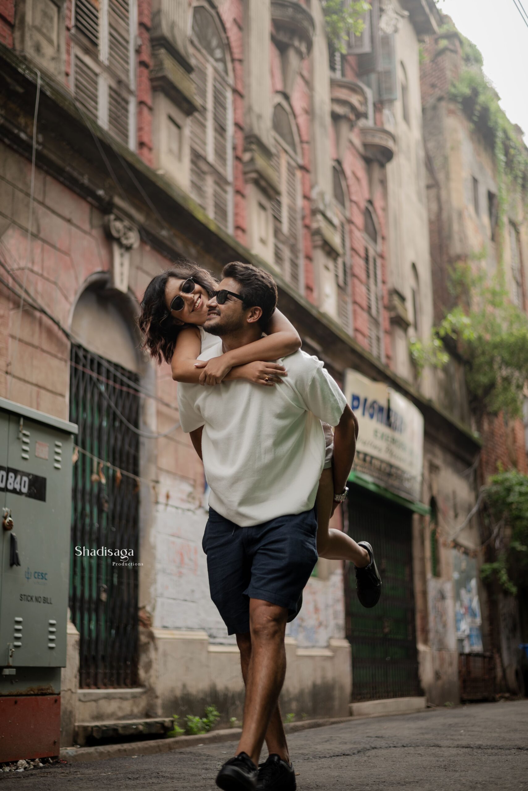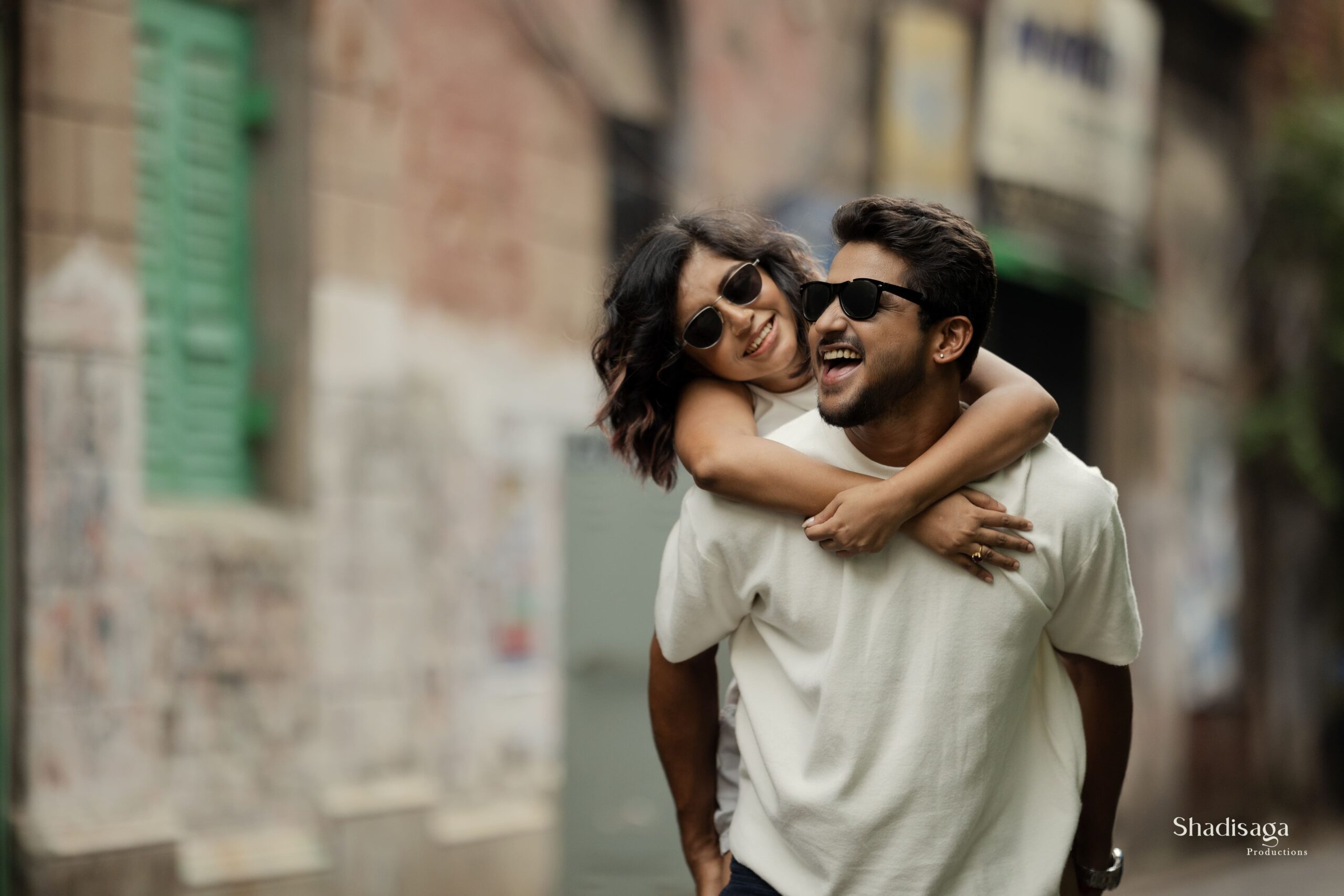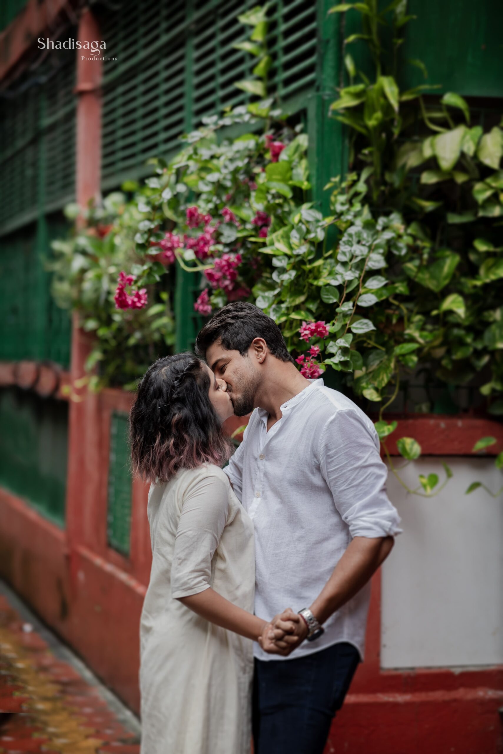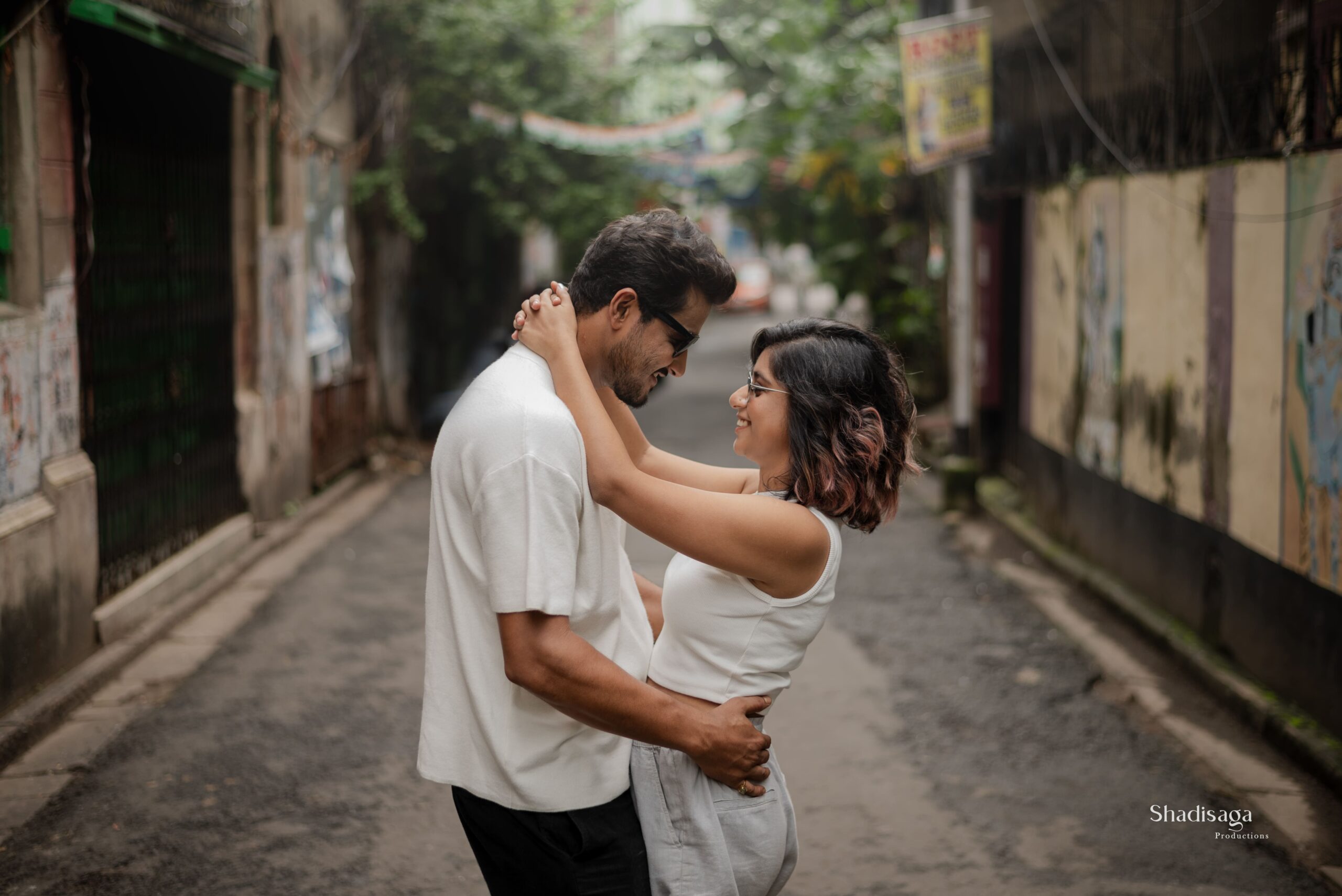 A candid pre-wedding photoshoot featuring a couple sharing a warm moment against a rustic red backdrop. Captured by Shadisaga Productions