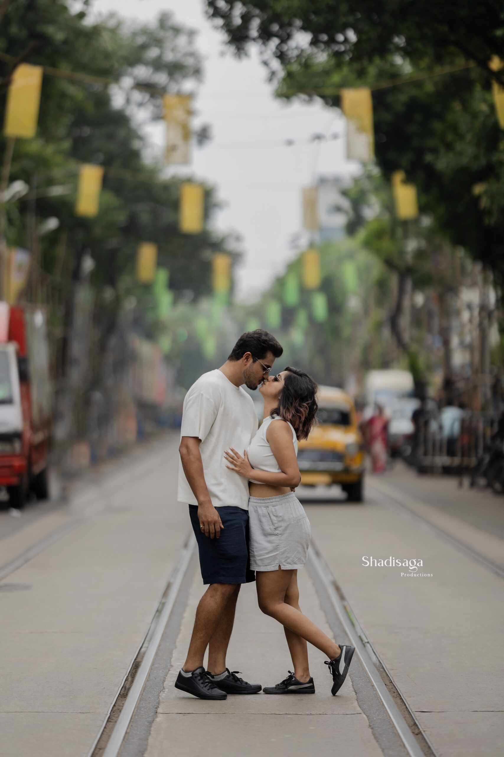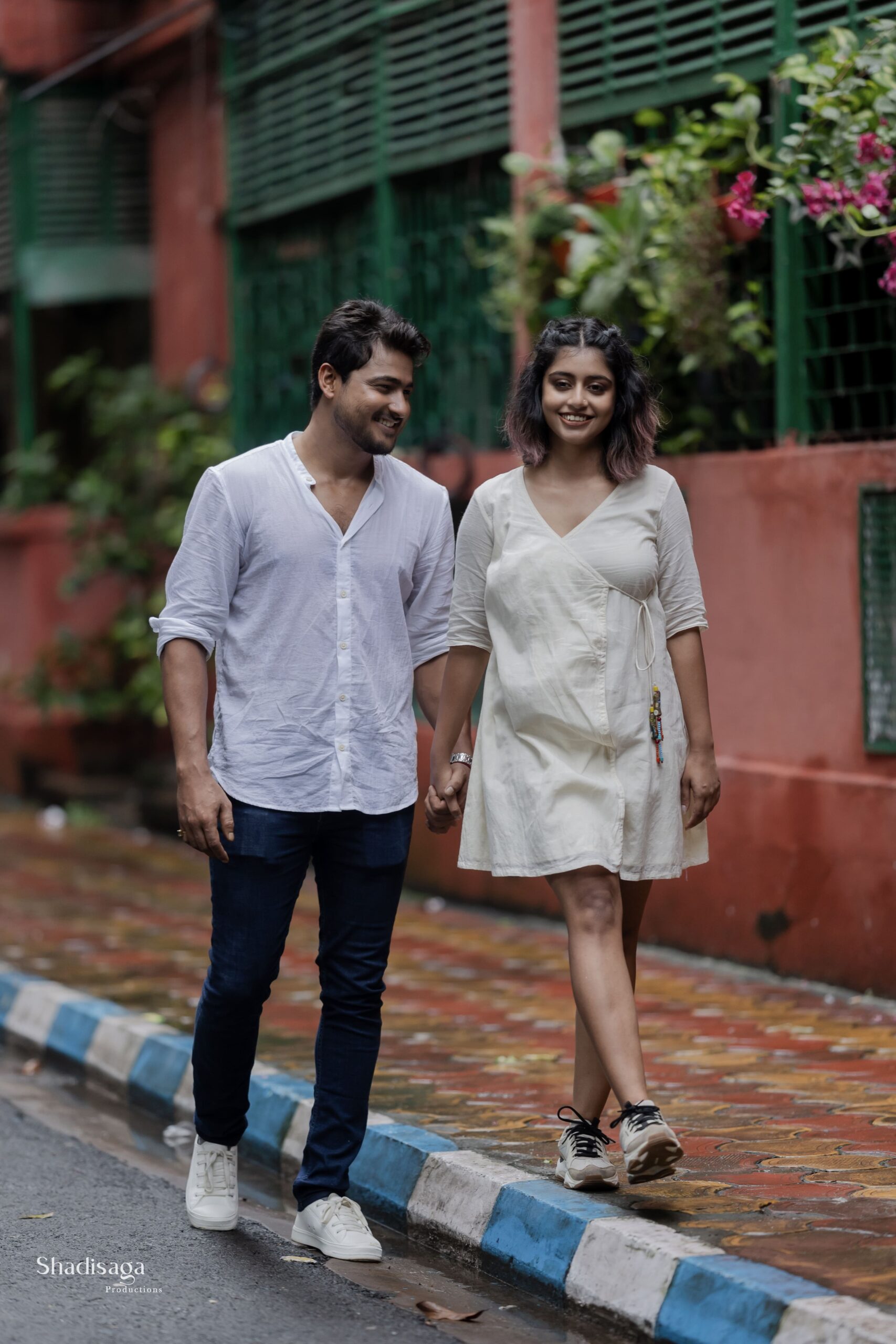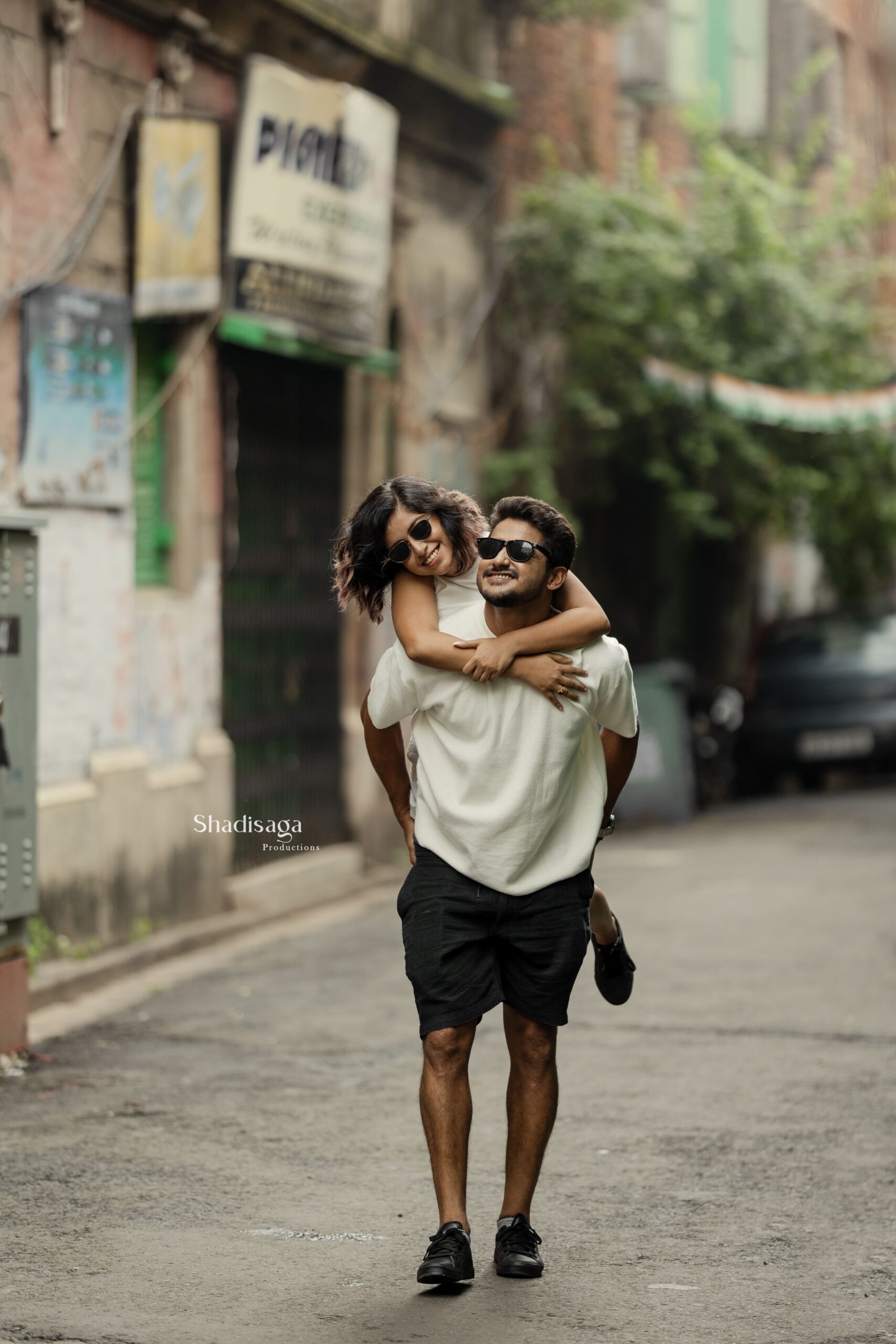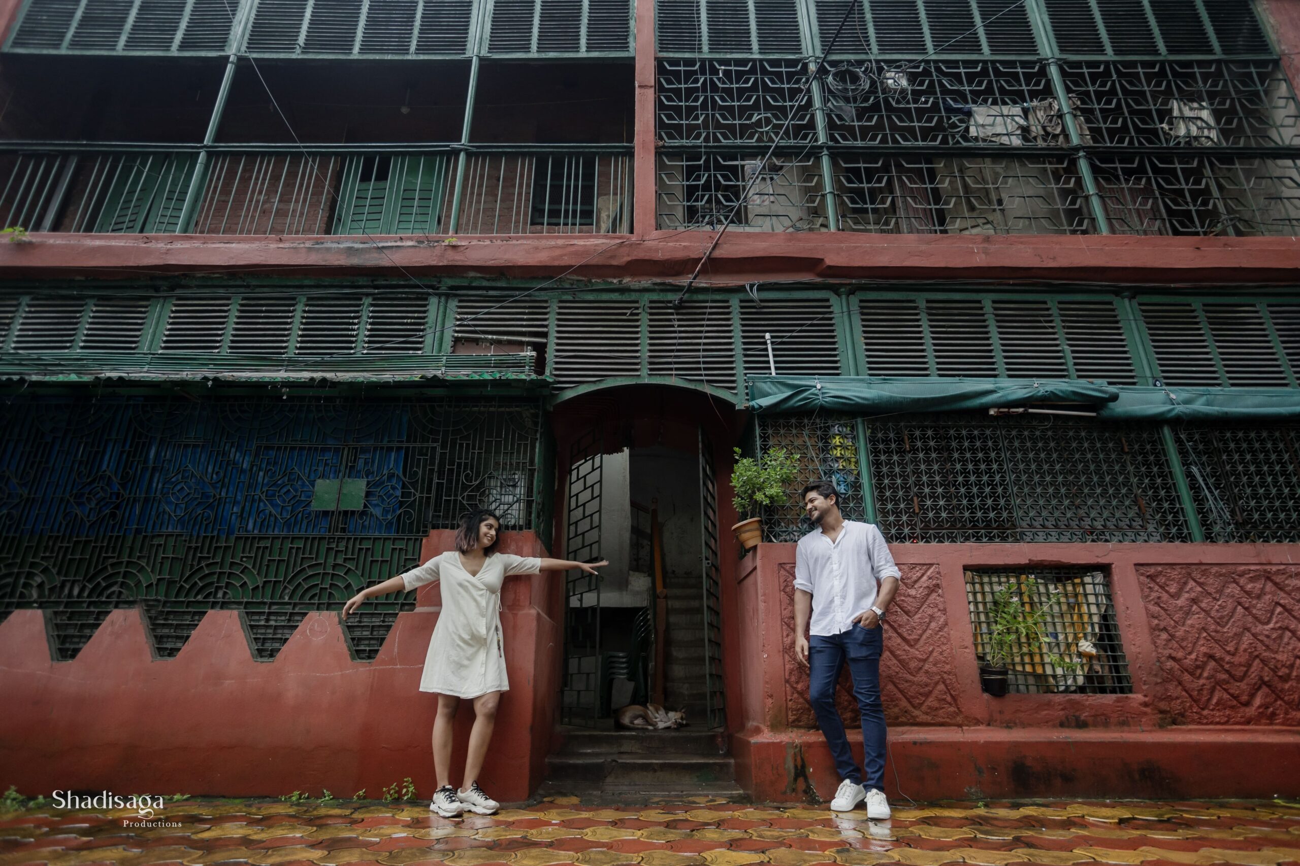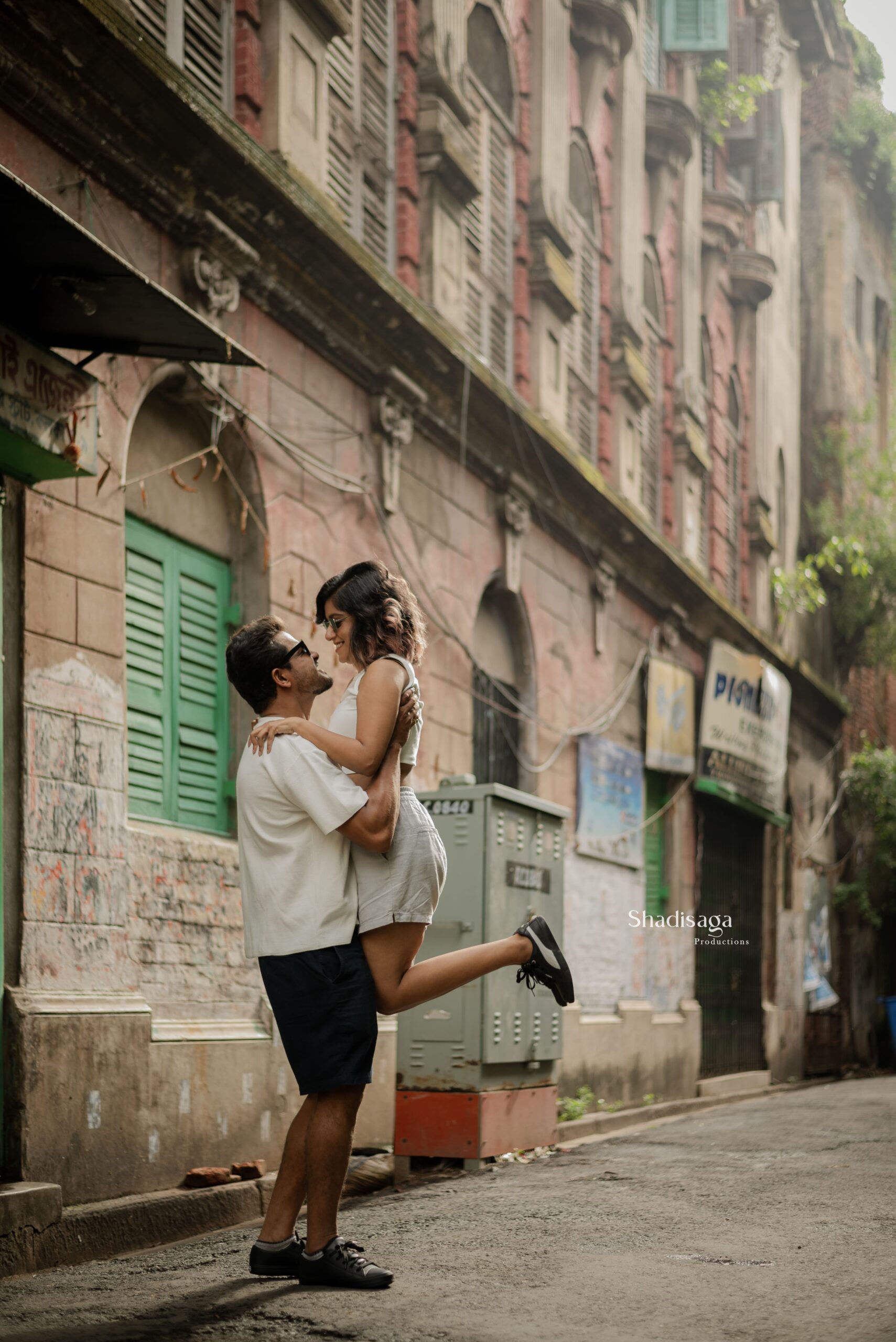 A candid pre-wedding photoshoot featuring a couple sharing a warm moment against a rustic red backdrop. Captured by Shadisaga Productions